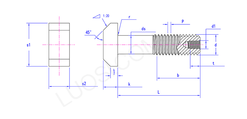 Delikli azaltılmış sap cıvatasının başı bir eşkenar dörtgene benzer ve sabitlenecek ve dönmemesi için t yuvasına sıkışıp kalabilir. Vidasının orta kısmı daha ince hale geldi, yani "büzülmüş çubuk" ve vidanın altına bir delik de açıldı. İç içi boş.